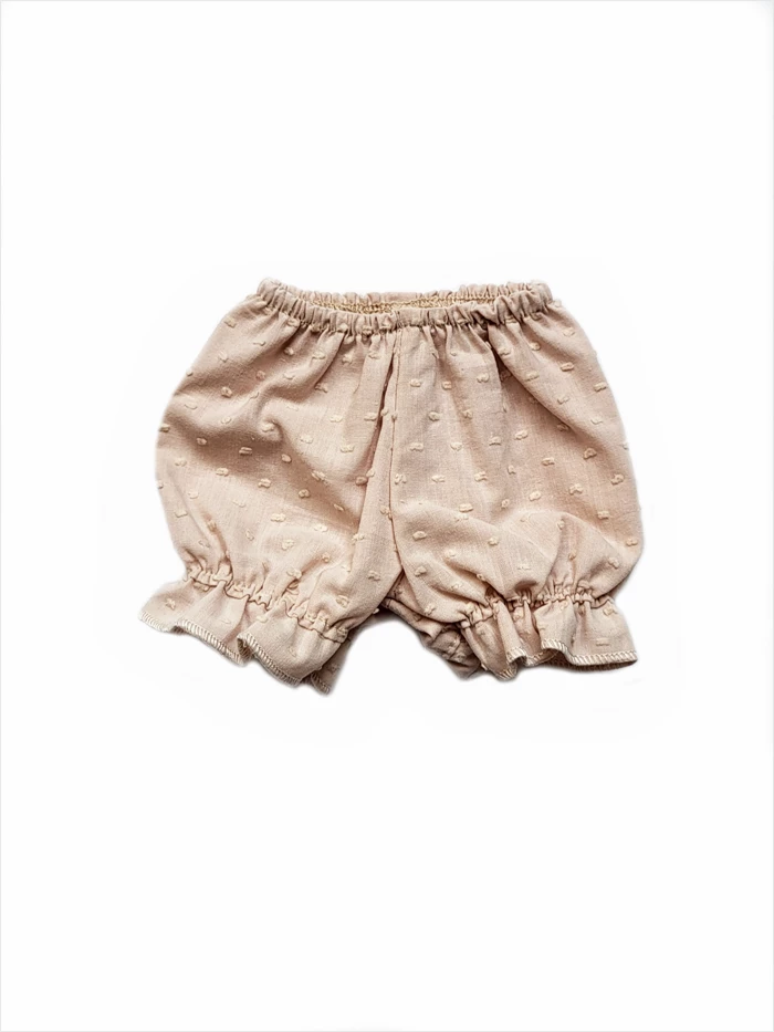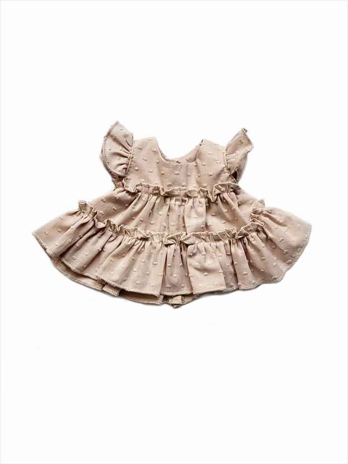 A delicate airy set made of powder pink plumeti cotton. It consists of a long blouse and panties with frills.