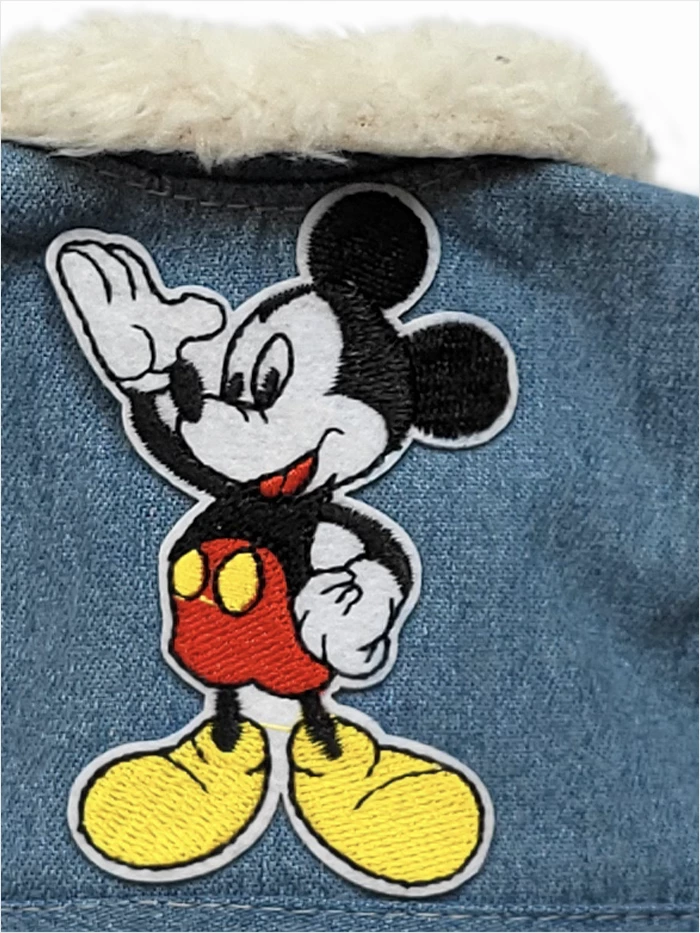 A denim jacket with pockets, a soft fur collar and a patch on the back.