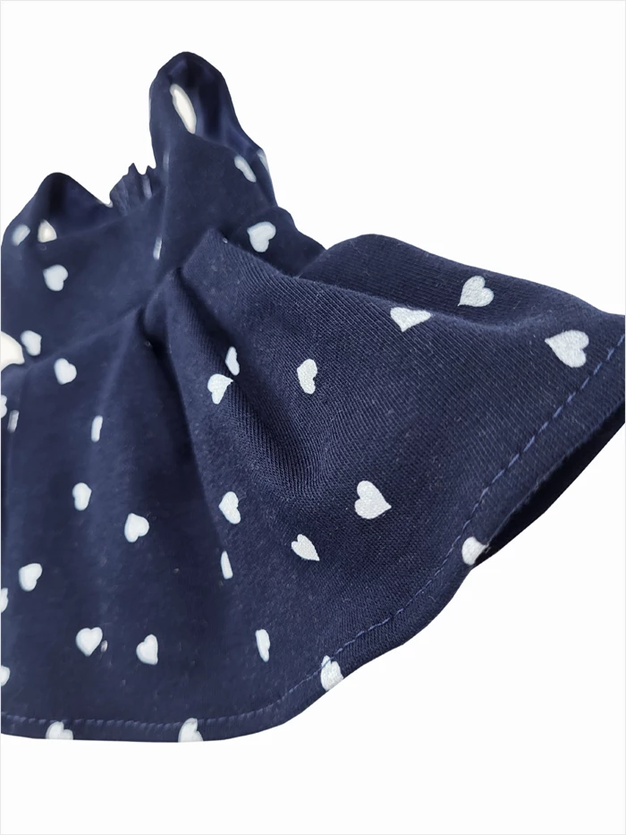 A lovely navy blue dress with hearts pattern for your doll. Made of soft sweatshirt fabric. It looks great with our T-shirts and long-sleeved tops. Children practise their small motor skills by wearing dolls.