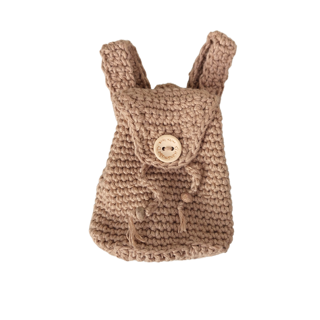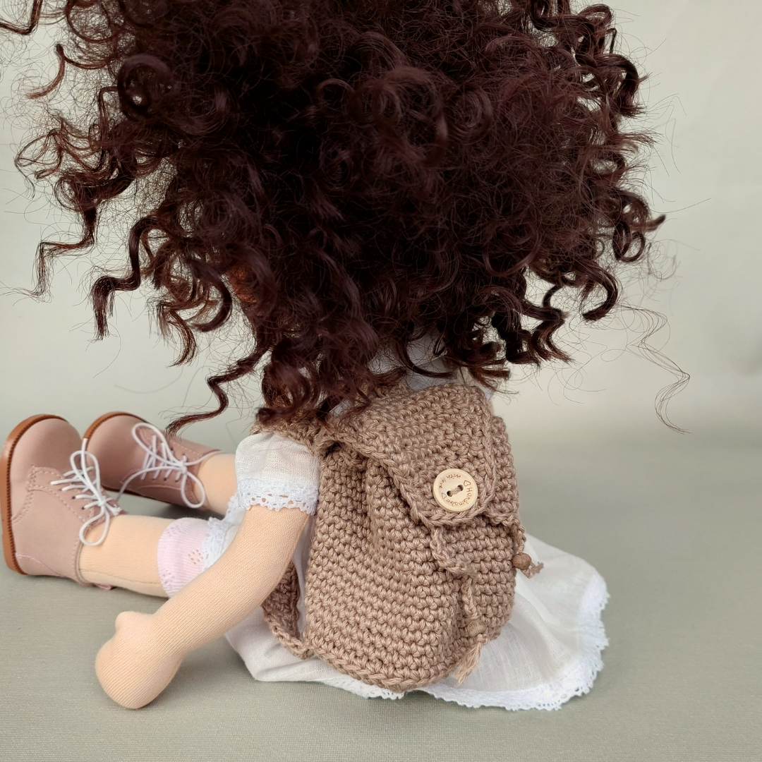 Ręcznie robiony plecak dla lalki w pięknym naturalnym kolorze, zapiany na drewniany guzik.