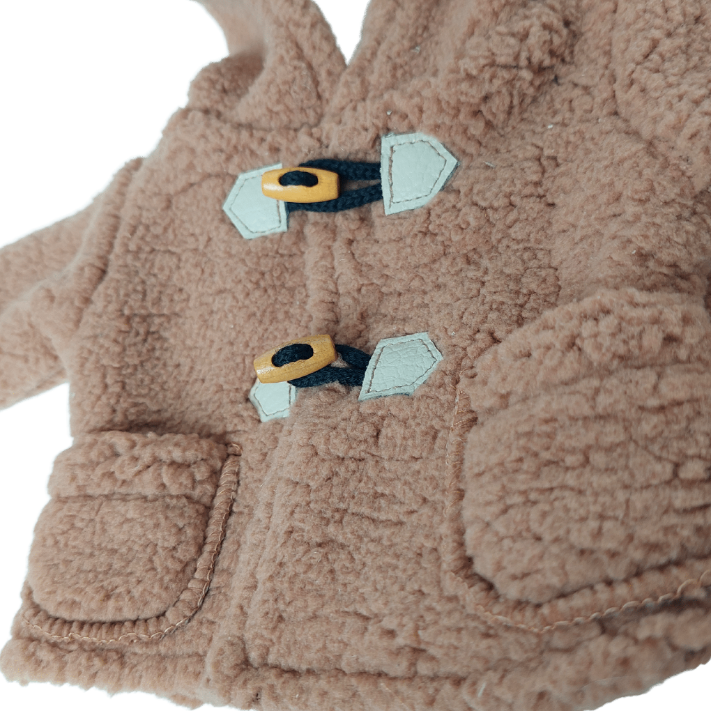 A brown cotton sheepskin coat with a white knitted lining, fastened with wooden buttons - pegs is a perfect complement to the doll's wardrobe.