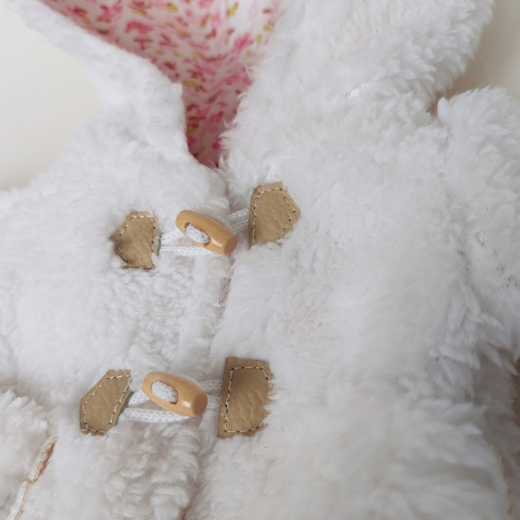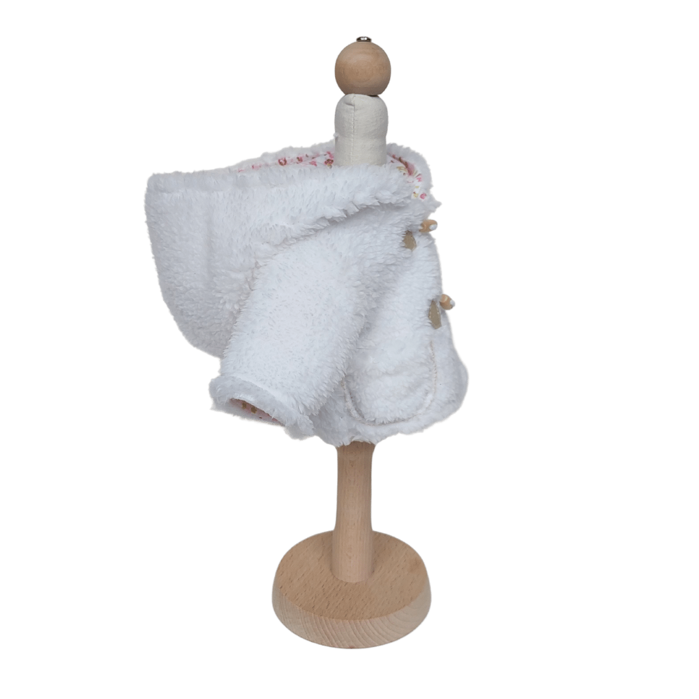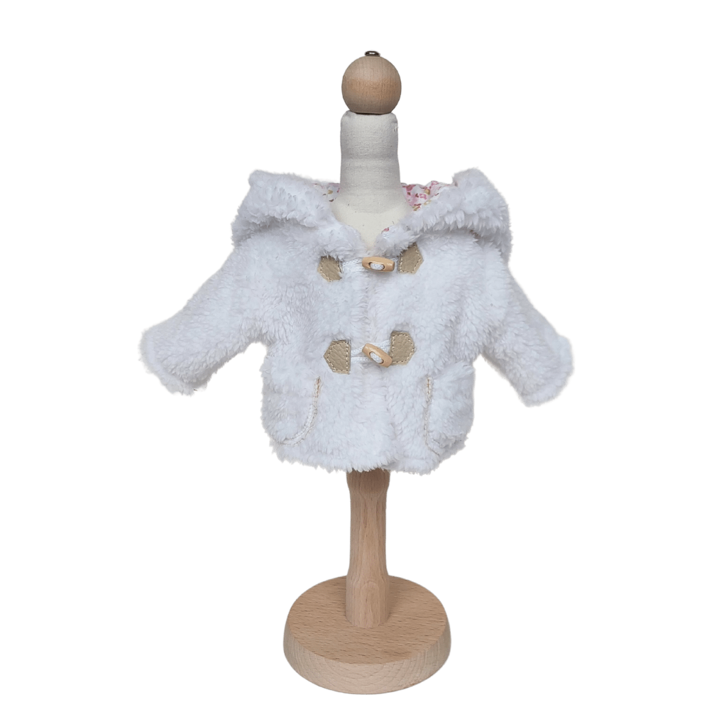 A cotton white sheepskin coat with a hood with a pink knitted lining, fastened with wooden buttons - pegs is a perfect complement to the doll's wardrobe.