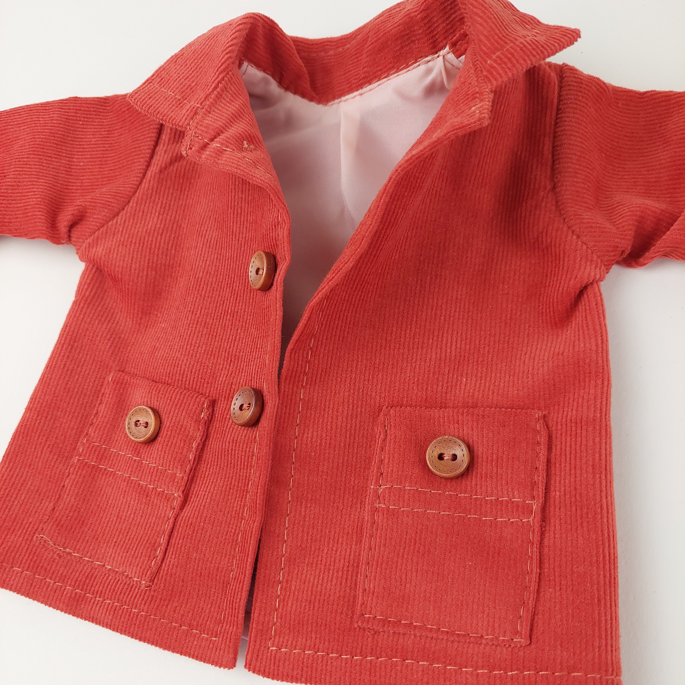 A corduroy coat with a red lining, decorated with wooden buttons, is a perfect complement to a doll's wardrobe.